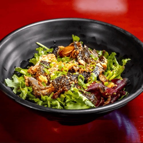 BBQ salmon skin, tobiko, and scallion with spicy sauce