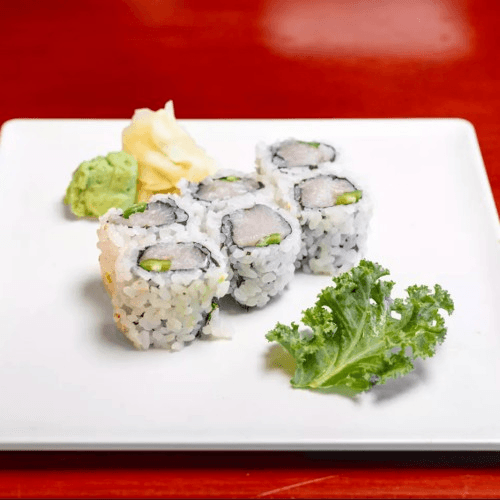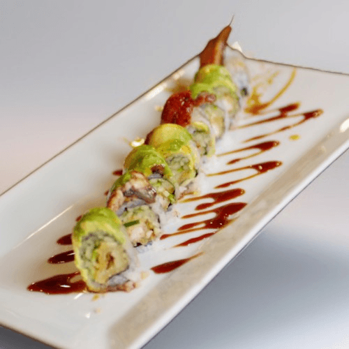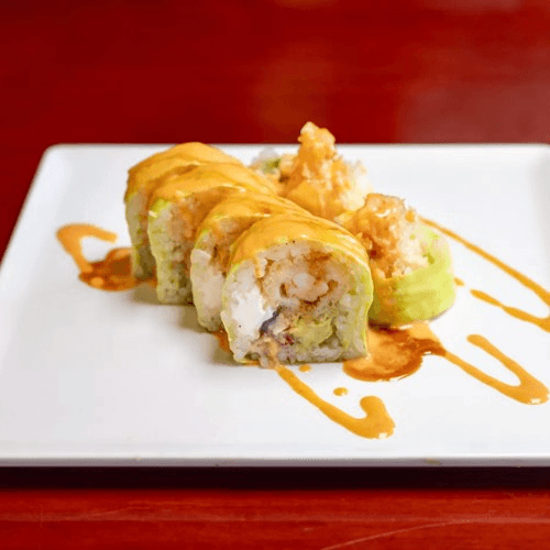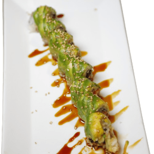 Shrimp Tempura, eel, cream cheese, and avocado wrapped with Green Soy Bean Paper. Top with Spicy mayo and eel sauce