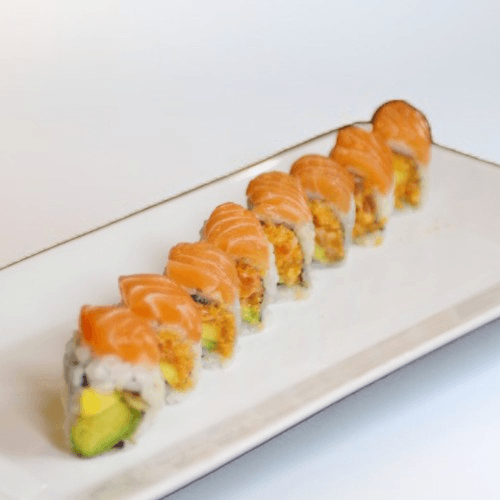 Crabmeat, avocado, spicy tempura flakes, sliced salmon, and tobiko