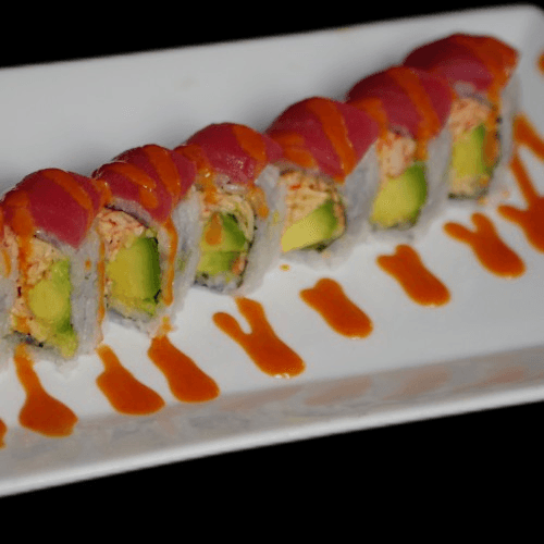 Inside spicy crab, avocado, crunchy top red tuna with chili sauce