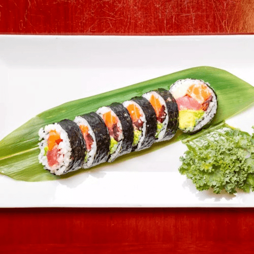 Six pieces California roll, six pieces salmon avocado roll, six pieces eel cucumber roll, eight pieces tri-color roll, eight pieces kuchi special roll, eight kinds of nigiri sushi three pieces of each following: tuna, salmon, white tuna, eel, crab, shrimp, red snapper, albacore tuna