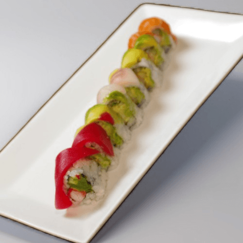 Crabmeat, cucumber, and avocado top tuna, salmon, and yellowtail