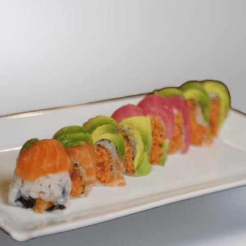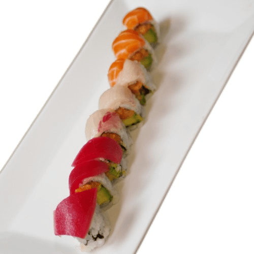 Tuna, salmon, white tuna, avocado, and crunch with green soybean paper, spicy mayo on top.