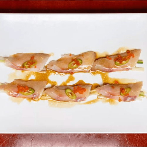 Slices of Yellowtail sashimi with ponzu sauce, top with jalapeno and tobiko