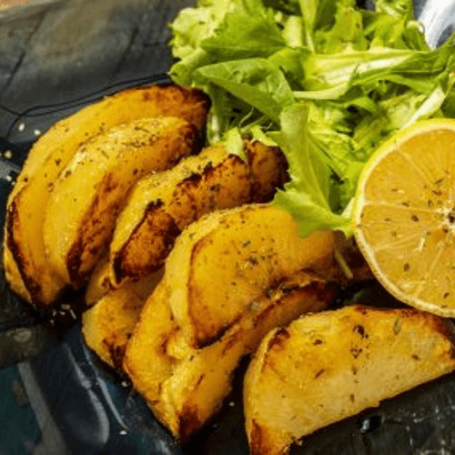 Wedged potatoes roasted in olive oil, garlic, vegetable broth, oregano, salt, pepper and fresh-squeezed lemon juice. Family favorite recipe from many a Greek holiday meal, ready to enjoy anytime!