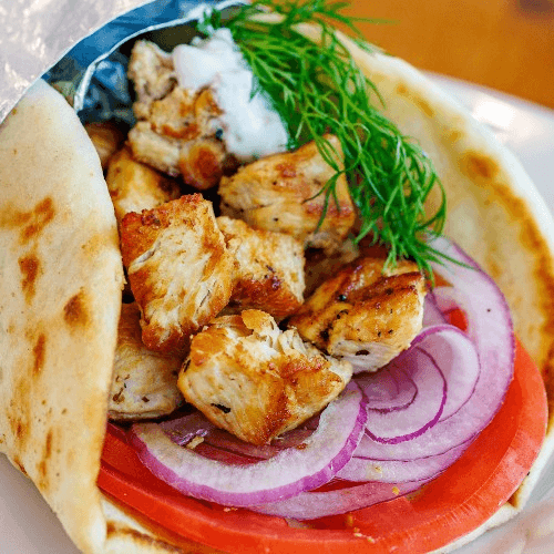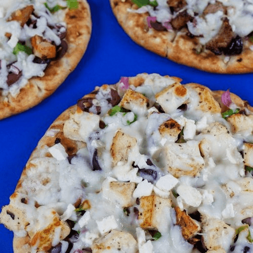 Pita, extra virgin olive oil, red onion, Kalamata olives, green peppers, imported Feta & blend of shredded mozzarella and Greek kaseri cheeses. *Vegetarian.