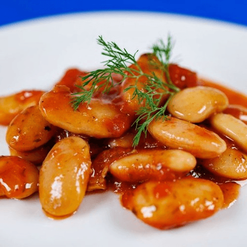 Giant Greek beans in tomato sauce and olive oil--simple and satisfying.