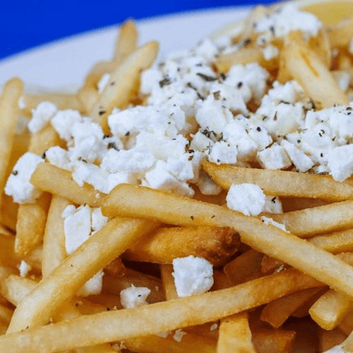 Crispy shoestring fries topped with Feta, seasoned with lemon pepper, oregano, and salt. Served with a wedge of lemon.