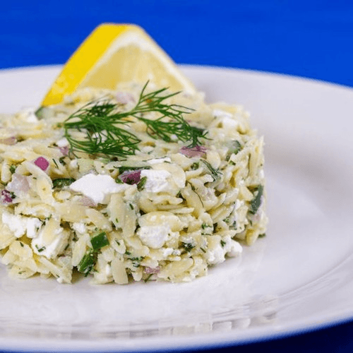 Greek manestra (orzo) salad tossed with red onion, cucumber, lemon juice, imported Feta, olive oil & dill. Perfect for summer, customer-craved year-round.