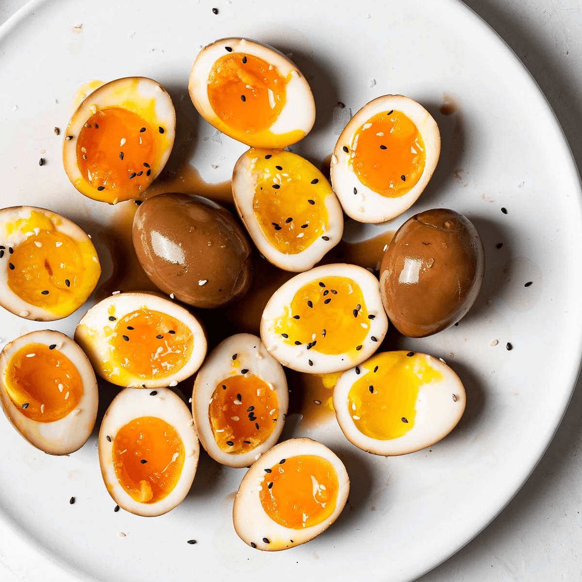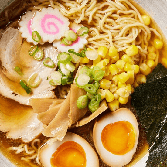 Soy sauce-based broth, pork belly, bamboo shoots, soft-boiled egg, scallion, seaweed, naruto fish cake