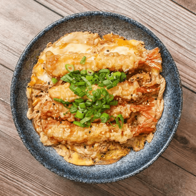 Soy sauce blended broth, corn, soft boiled egg, bamboo shoots, scallion, seaweed, fish cake served with two shrimp tempura