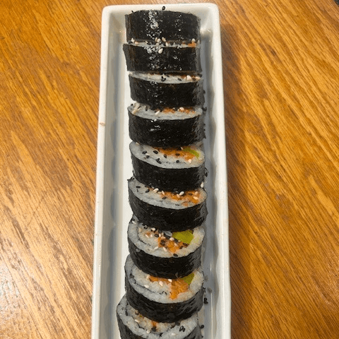 White rice, seaweed, crab sticks, cream cheese, carrots, cucumber, Spanish sesame oil, sesame seeds