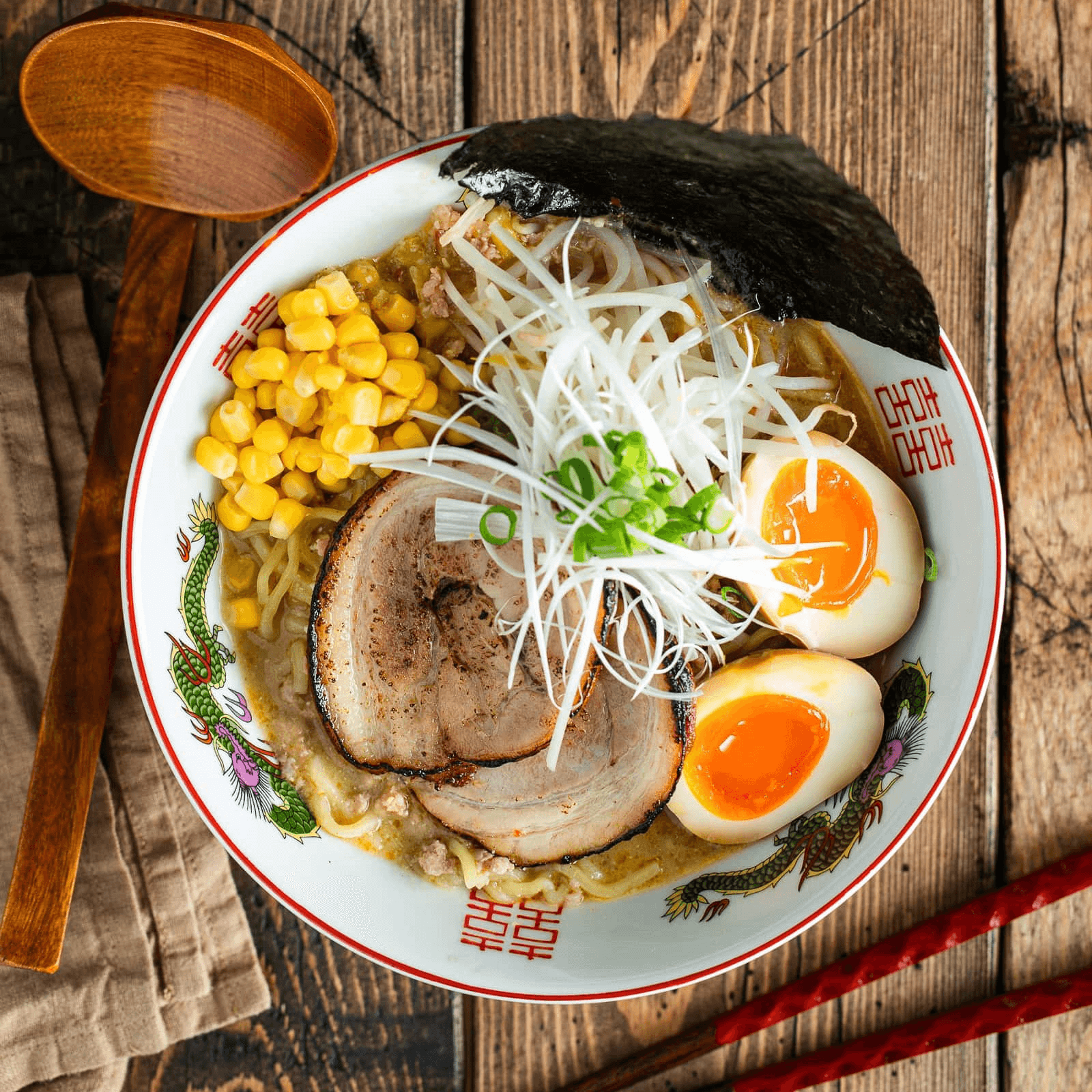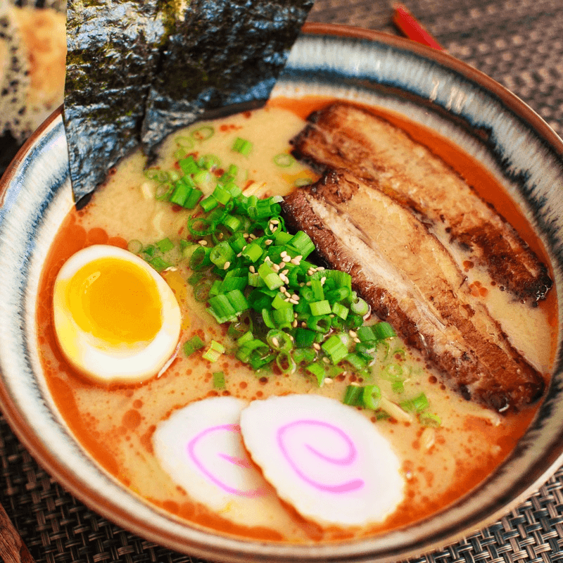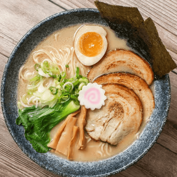 A rich creamy pork bone broth, thin noodles, chashu pork, soy sauce egg, Naruto fish cake, bog choy, menma bamboo and scallions.