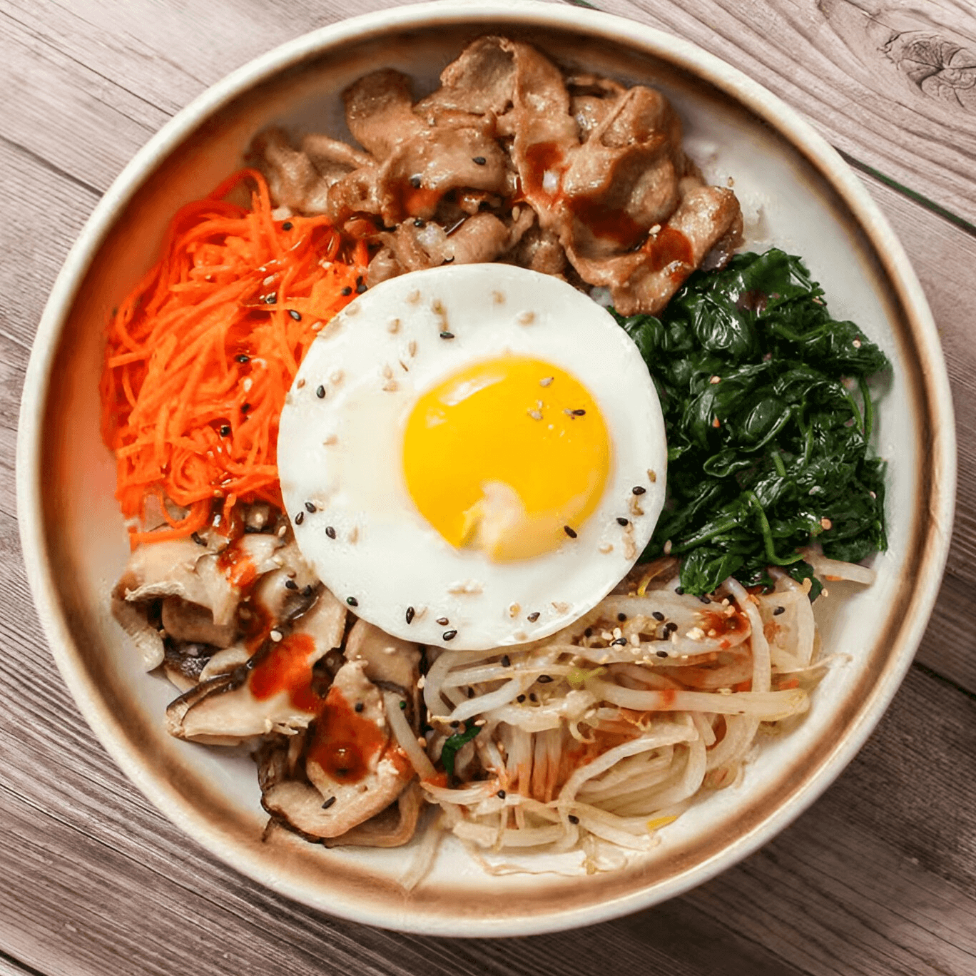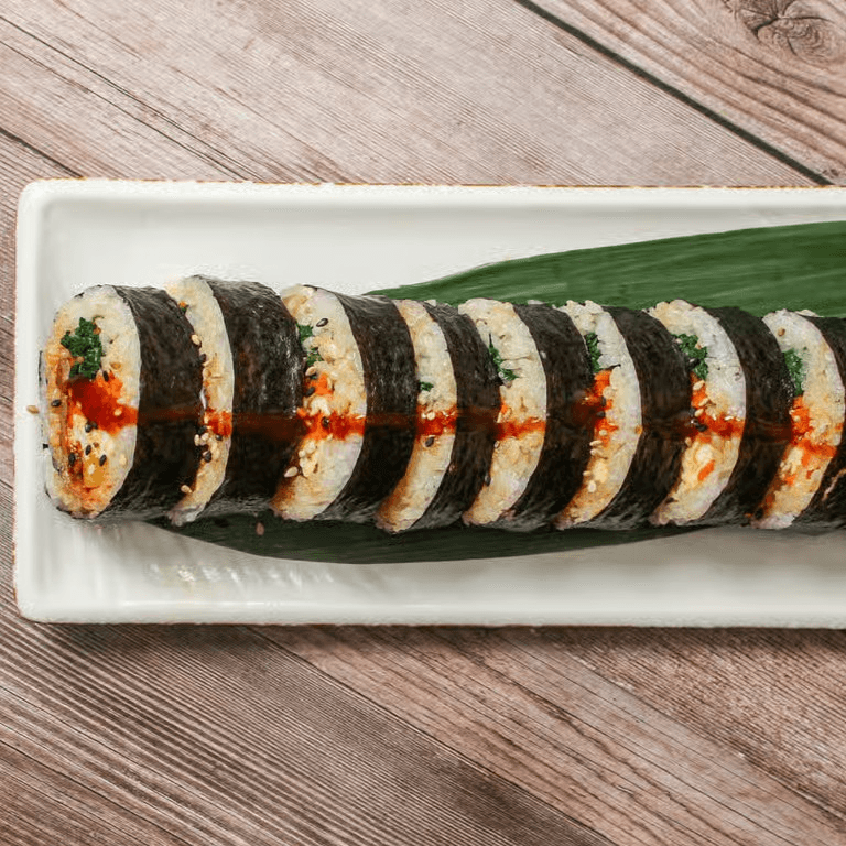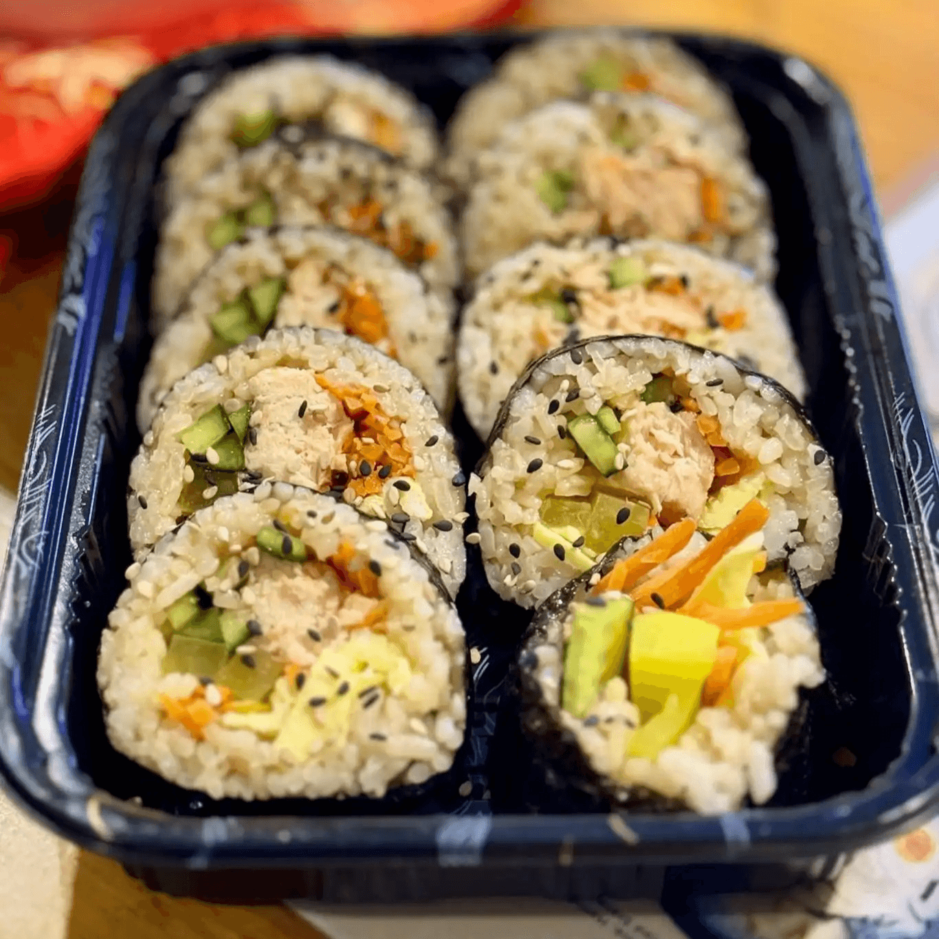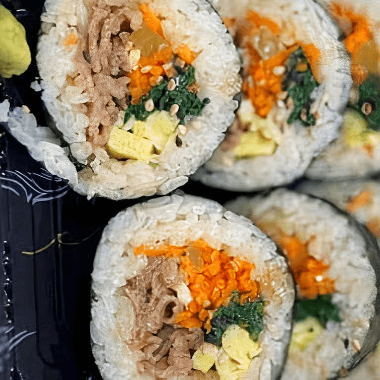 White rice, seaweed, all-natural bulgogi beef, carrots, cucumber, sesame oil, sesame seeds and egg