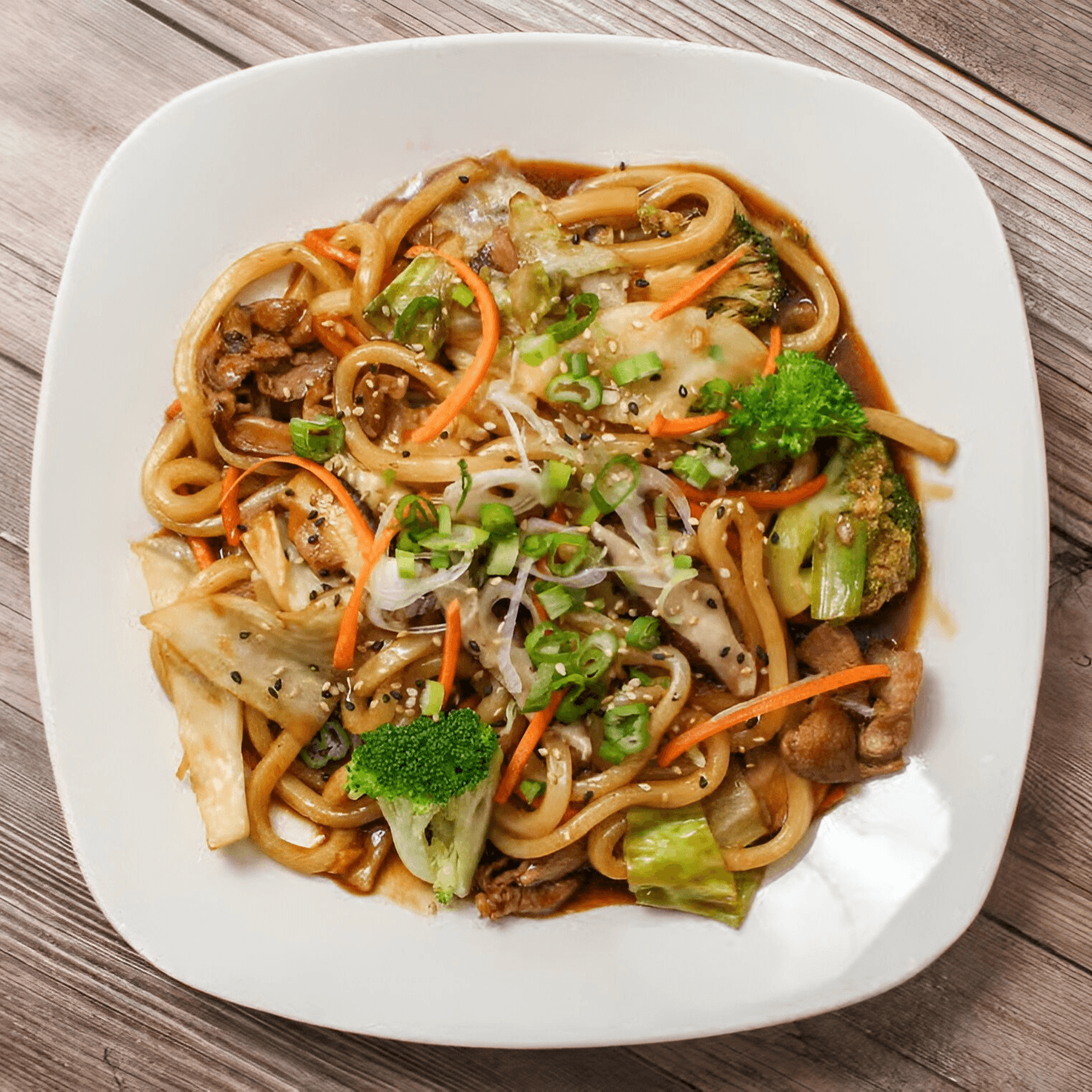 stir-fried udon noodles, meat or seafood, and vegetables in a yaki sauce. Available with pork, beef, chicken, shrimp, or vegetable.