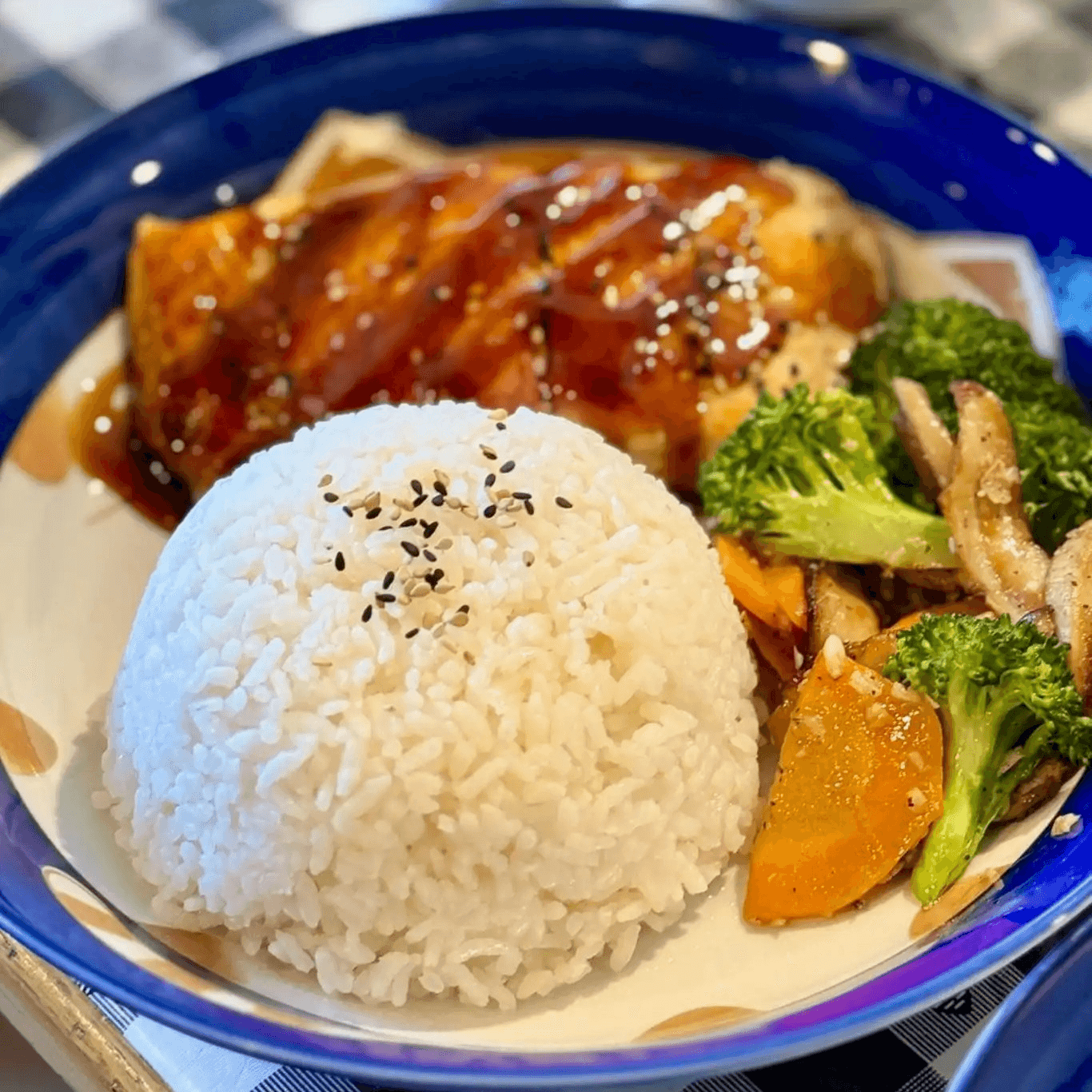 Brown rice (Rice in teriyaki sauce) seaweed, salmon grilled teriyaki, carrots, cucumber, sesame oil, sesame seeds and egg